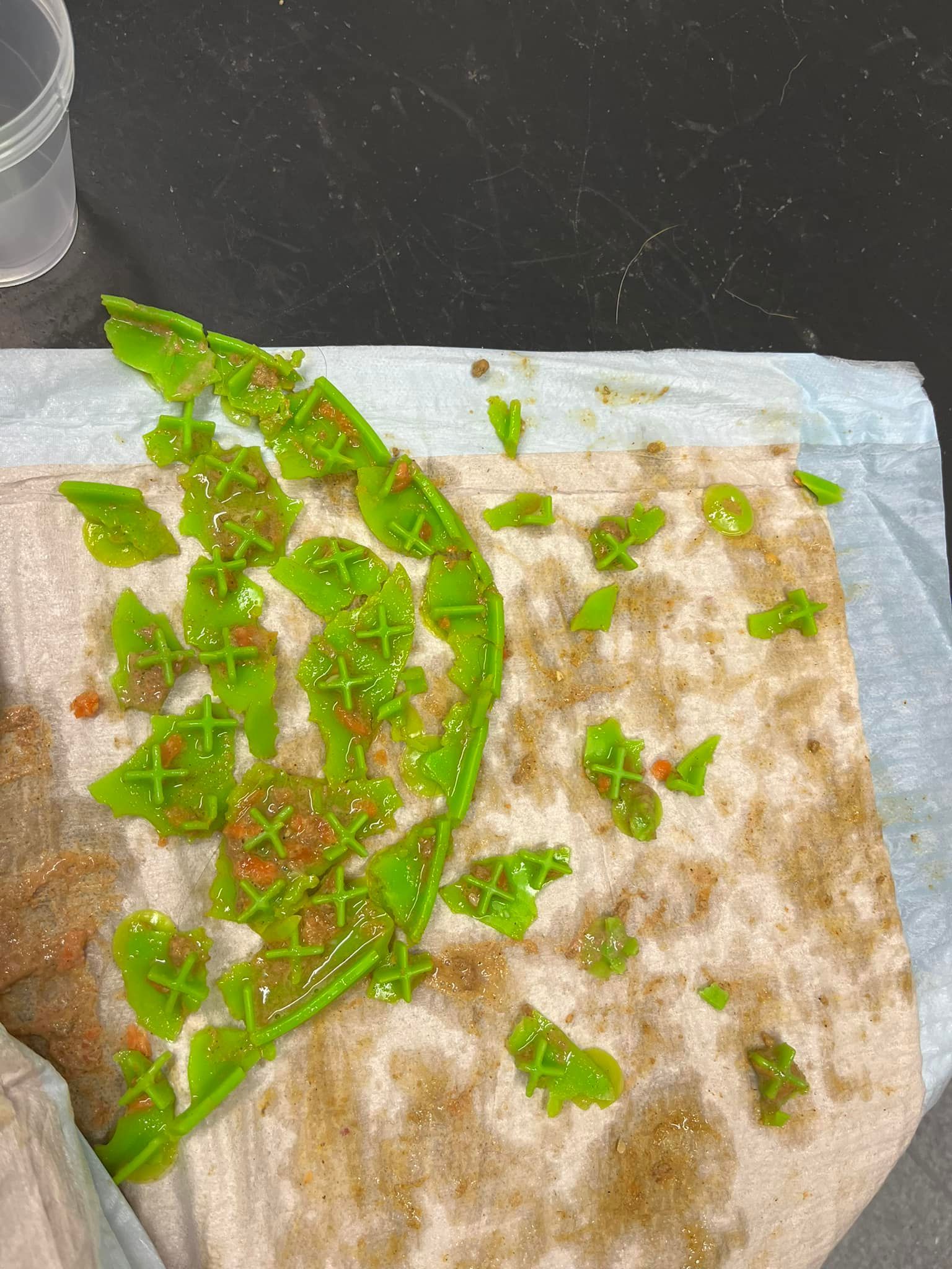 Hm, nein! Das Problem hier war, dass der Hund ungefähr zwei Stunden mit seiner Schleckmatte allein gelassen wurde, er hatte also alle Zeit der Welt, das Ding zu zerpflücken!