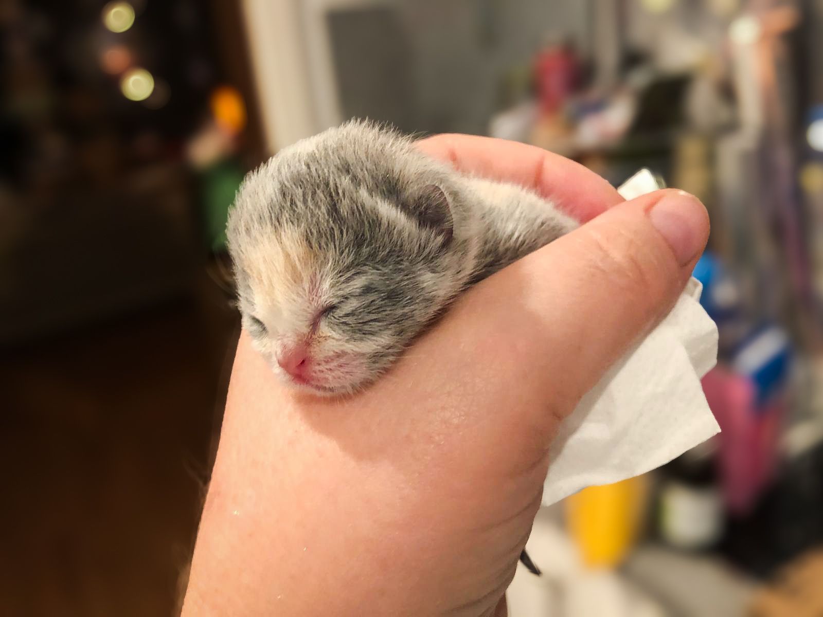 2. Anruf nachts um 1 Uhr: Die Kätzin ist jetzt in der Geburt, das erste Kitten kam vor ca. 20 Minuten. Es hat sich nicht bewegt, aber man dachte, das sei normal und die brauchen eine Weile. Aber jetzt kam das zweite Kitten und das hat sofort geatmet und sich bewegt, man mache sich jetzt Sorgen um das erste Kitten, ob man da nicht Wiederbelebung machen müsse.